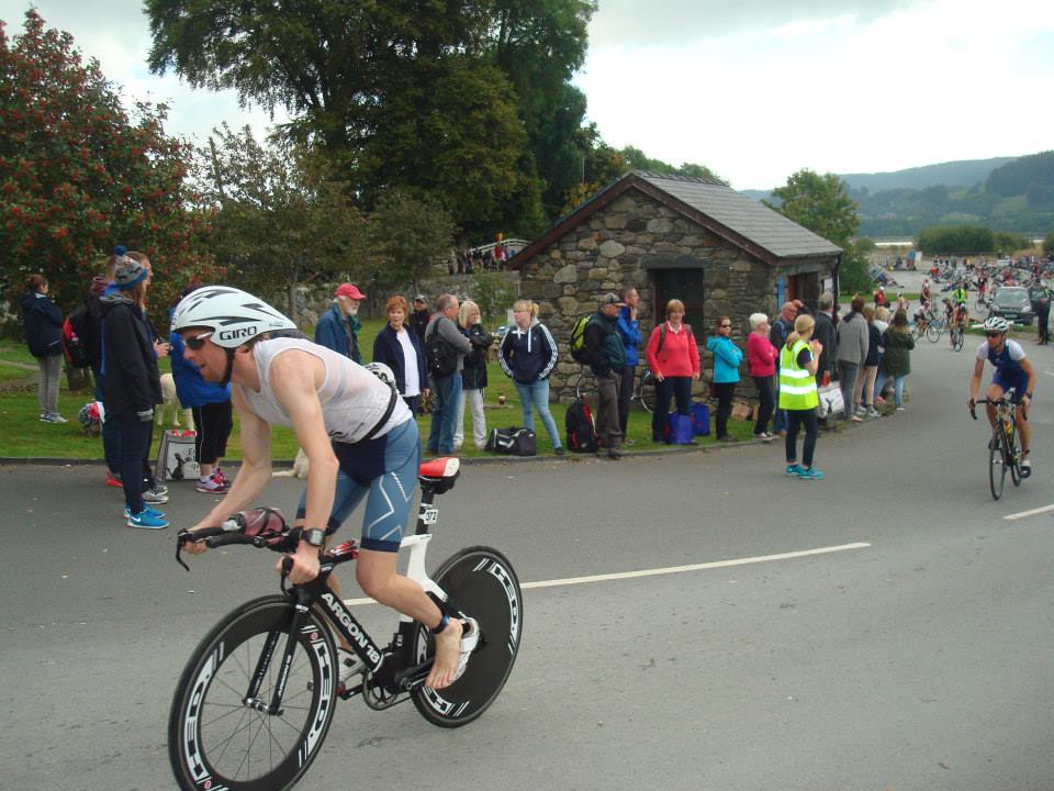 We’d started in the second wave so I used the two guys ahead of me to push through the stragglers and my effort was higher on the way back. It was still a very nice swim though. The Bala swim ends with a shallow finish over a rocky ground so I pulled my way as far in as I could before hobbling through to the exit. My swim time was ok, and the course was a little long. I dropped the two guys through transition even though I found when I jumped onto my bike that I’d forgotten to undo my bike shoes. Oops. I stopped, unstrapped my right shoe, stuck my foot in, strapped it up and carried on up the hill to the main road.