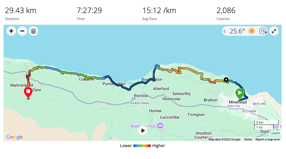 The idea was to have an easier day of maybe 25km to ease into walking every day but of course you add a km from the bus to the start, you add a couple of km to the campsite and the next thing you know it’s a 29 day with lots of climbing. It was 28C for most of the day but as it took us 6 hours to get to Minehead we started walking late and half of our walking was in the not so hot evening.