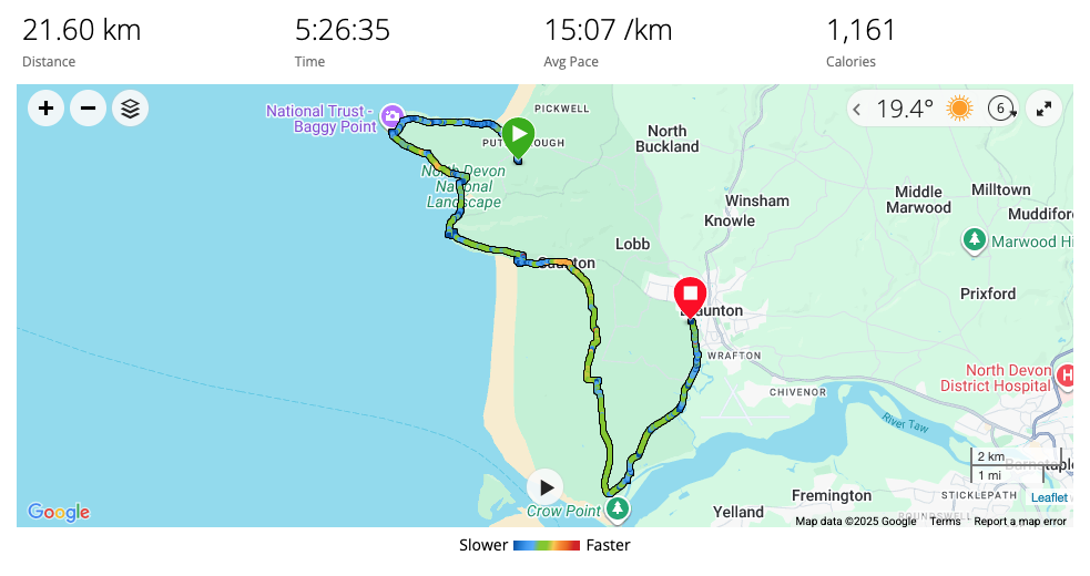 You do mental maths on the trail. Notes say it’s 15 miles from Woolacombe to Braunton. 10 miles is 16km. 15 miles is around 24km then. We did the 3km from Woolacombe to the start of Baggy Point so it will be around 21km to Braunton plus the walk back to the path from the campsite this morning. We’ll aim for that and see what the time is and what campsites are about.