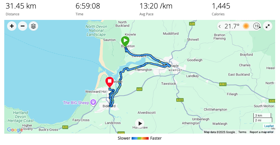 Barnstaple and Bideford are connected by an excellent cycle path with a visitor centre for the railway that used to be here halfway along offering a break and a cold, sugary, caffeinated drink. For the walker on a hot day there is a 5km straight march followed by a gentle curve into another 5km straight march. You can see into the future. Chat and get on with it.