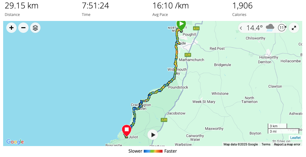 We dallied at the cafe as the staff charged our spare batteries for us and fed us bacon rolls and cappuccinos. Leaving and crossing over the canal lock took us back to the path and up our first steep section of the day to the tower view point. But for much of the way to Widemouth Bay it went easy on us.