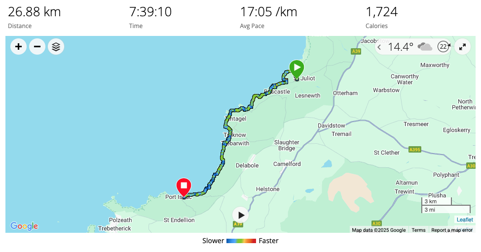 The final section got back to its old habits of dips and steps, with a strenuous finish. The sun came out and greeted us to our destination. The coast path dropped us gently into Port Gaverne right at the pub icon on the OS map. The bartender welcomed us and sent us to our room to clean up, before returning to prop up the bar, eat in the restaurant, and prop up the bar again. Then wash our socks.
