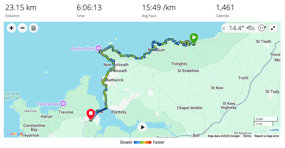 Eggs Benedict for breakfast with fresh coffee, but it looked like I wouldn’t be getting my mid-morning cappuccino on the section of coast path through Port Isaac to Polzeath. It’s not a long run around the headlands and into the estuary of the river Canel but it is quiet.