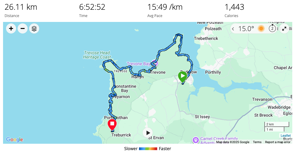 It is bays for days. This stretch of Cornwall is popular because people like beaches and here be beaches. The bank holiday weekend has not yet started but crossing sandy bays as part of the coast path requires fine navigation skills to not get lost amongst wind breaks, sunshades, surfboards and hundreds of people in shorts or swimsuits. Keen communication skills are needed to keep us together and up through the soft sand to the exit steps.