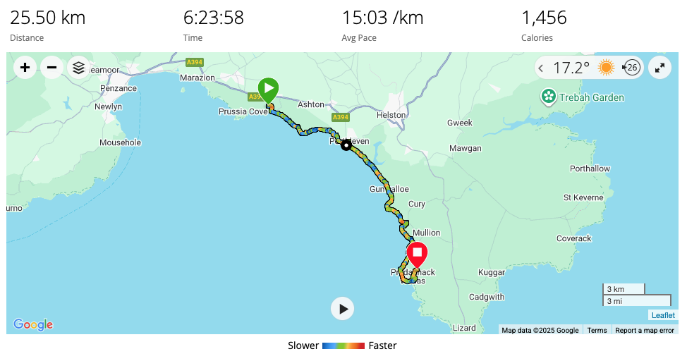 It was easy and pretty all the way to Porthleven, which, like many places you look at on the map, was much bigger than expected. We found an excellent cafe by the harbour and even Kim had a full English for second breakfast. The chef was not happy with how the bacon was cooked so cooked some more and gave us it all. It was all eaten.