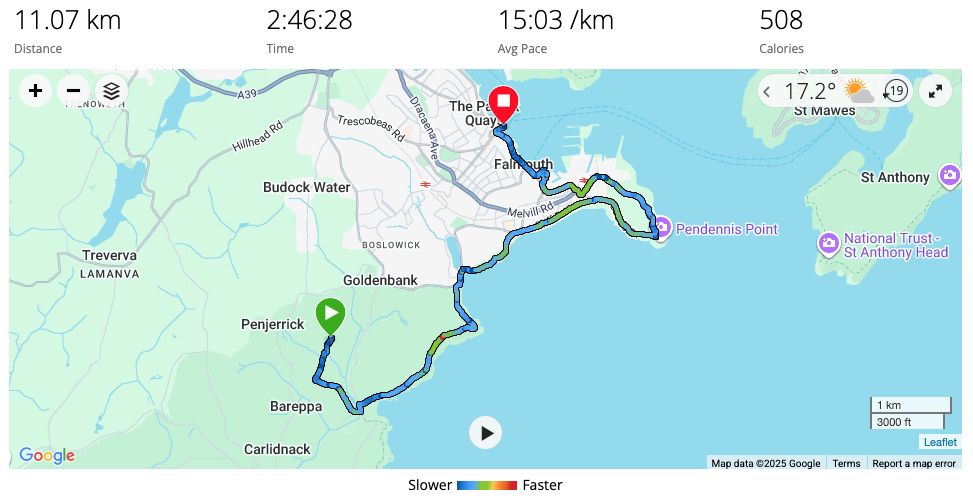 We flowed around to the Prince of Wales pier looking for that final acorn sign that would show us the last part of the SWCP before the ferry but found none. The OS map showed us the path to the pier, and this was as far as we could go. To continue the SWCP we would need to take the ferry across to St Mawes and St Anthony (yes, another St Anthony ferry if you’ve really been paying attention). This will have to wait for another year, but I don’t know when. I will have shiny new students to tell fascinating anatomy facts to later this week.