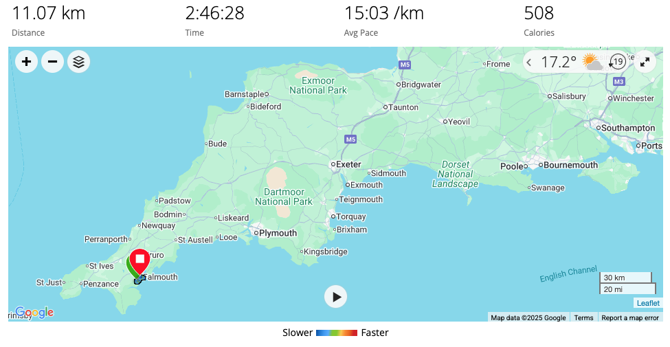 We have walked more than half of the South West Coast Path from Minehead to Falmouth. We have walked 620km (385 miles), officially 538km (334 miles) of the SWCP, with 20,500m of ascent in 20.5 days. That’s quite a lot. Today was a short day.